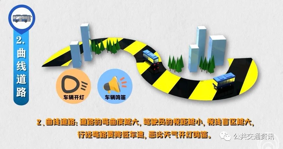 2、曲線道路:道路的彎曲度越大,駕駛員的視距越小,視線盲區(qū)越大,行經彎路要降低車速,惡劣天氣開燈鳴笛。