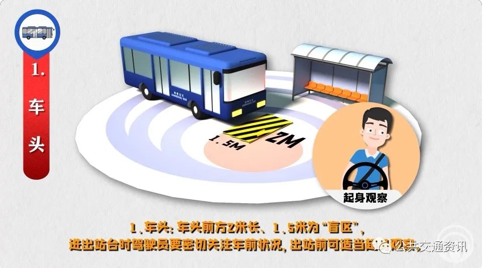 2、旁車“盲區(qū)”:同向車頭、對向車尾都是己車“盲區(qū)”,駕駛員要做到“同向超車當心車頭、對向會車當心車尾”,防范突然躥出橫穿馬路的行人。