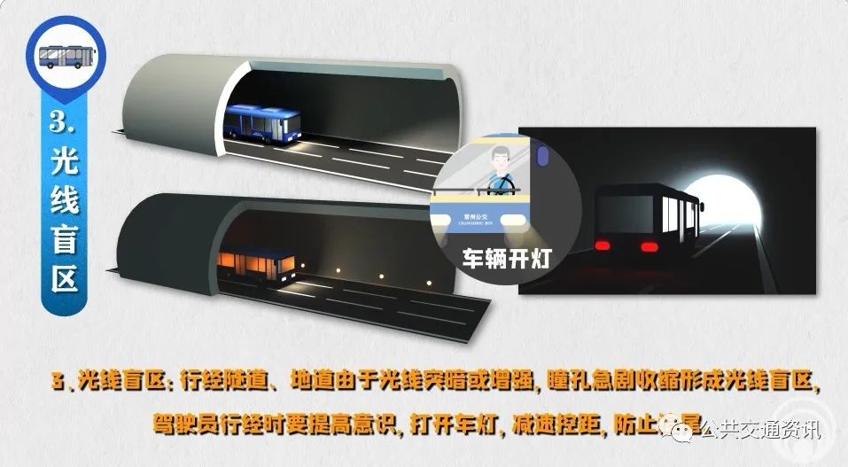 3、光線盲區(qū):行經隧道、地道由于光線突暗或增強,瞳孔急劇收縮形成光線盲區(qū),駕駛員行經時要提高意識,打開車燈,減速控距,防止追尾。