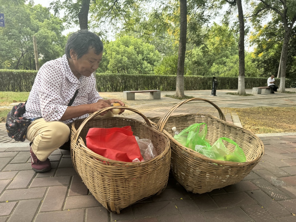 臨近正午,石大娘削著梨果充饑,等待回家公交車到來。