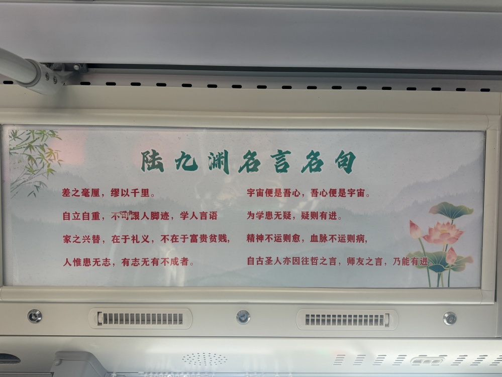“陸九淵號(hào)”不僅僅是一條公交線路,更是一個(gè)移動(dòng)文化陣地。當(dāng)你踏上這趟公交車,你會(huì)被駕駛員的熱情服務(wù)所感染,他們微笑著迎接每一位乘客,以優(yōu)質(zhì)的服務(wù)彰顯著荊門的文化精神和城市溫度。車輛全部采用新能源公交車,不僅環(huán)保節(jié)能,行駛起來也更為平穩(wěn),同時(shí),在車輛內(nèi)外裝飾以及“進(jìn)站、出站、溫馨提示”等場景語音播報(bào)融入陸九淵相關(guān)元素,讓乘客潛移默化的加深對(duì)荊門文化的認(rèn)識(shí)和理解。