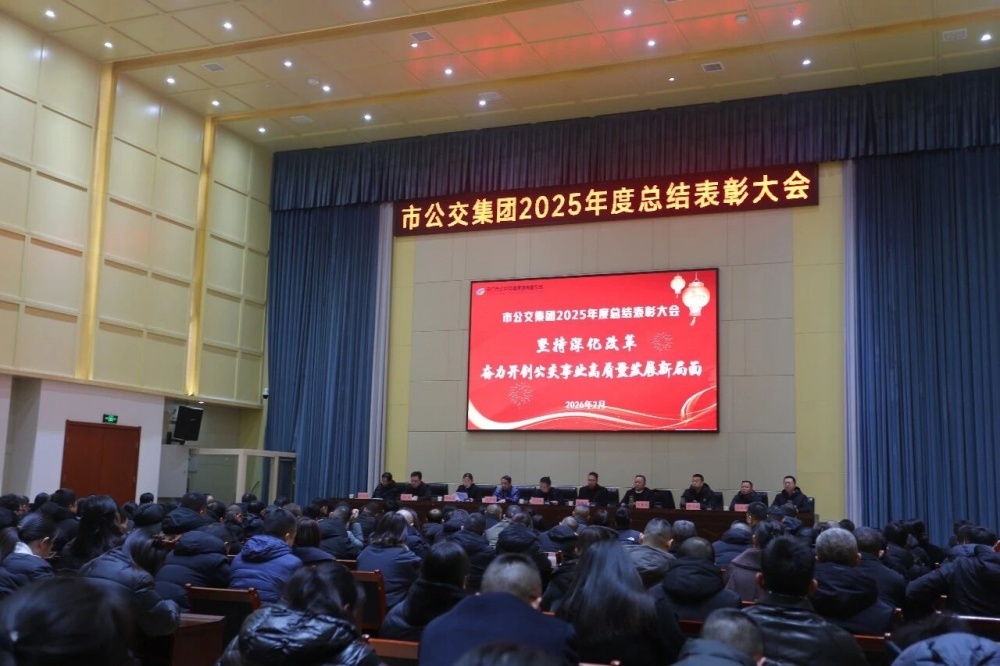 2026年2月9日,市公交集團2025年度總結(jié)表彰大會在集團三公司會議室順利召開。本次大會全面回顧了2025年及"十四五"時期集團的發(fā)展成果,表彰了先進典型,部署了"十五五"及2026年的重點工作,為集團高質(zhì)量發(fā)展凝聚奮進力量。市政府國資委黨委委員、副主任鄧興權(quán),市交通運輸局黨組成員、副局長李洪震,市客運管理處黨總支書記、處長劉來斌應邀出席會議。集團黨委班子全體成員、全體中層干部、機關(guān)工作人員、二級單位一般管理人員以及獲表彰的單位代表和個人參加了會議。大會由集團黨委副書記、總經(jīng)理李曉麗主持。