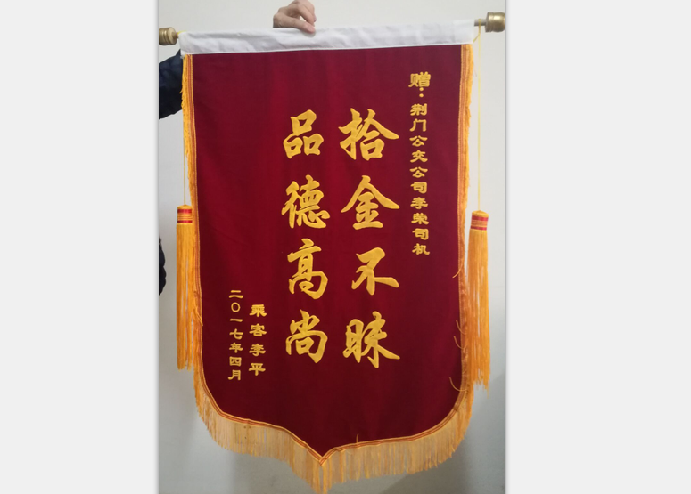2017年4月4日上午九點(diǎn)左右,一名乘客由于粗心大意,不慎將一個(gè)包包遺留在公交車(chē)內(nèi),包包內(nèi)裝有蘋(píng)果平板電腦一個(gè)、手機(jī)一部、金銀手飾一包、銀行卡數(shù)張、身份證、現(xiàn)金若干.......二公司三路車(chē)159#駕駛員李榮在到達(dá)運(yùn)動(dòng)公園始發(fā)站打掃衛(wèi)生時(shí)發(fā)現(xiàn)了一個(gè)紅色包包,該駕駛員立馬與隊(duì)長(zhǎng)取得聯(lián)系、剛好隊(duì)長(zhǎng)和站務(wù)在始發(fā)站,駕駛員李榮親自將包交給了隊(duì)長(zhǎng),并說(shuō)明原由,并在眾人下隊(duì)長(zhǎng)打開(kāi)了包包,發(fā)現(xiàn)里面的都是貴重物品。不久,失主打包內(nèi)的電話來(lái)詢問(wèn)此事,隊(duì)長(zhǎng)認(rèn)真做了回復(fù),告之為保證物品安全,要攜帶證明按程序認(rèn)領(lǐng)。當(dāng)天下午失主李女土從公司支部書(shū)記手中認(rèn)領(lǐng)失物。昨日送來(lái)錦旗一面。
