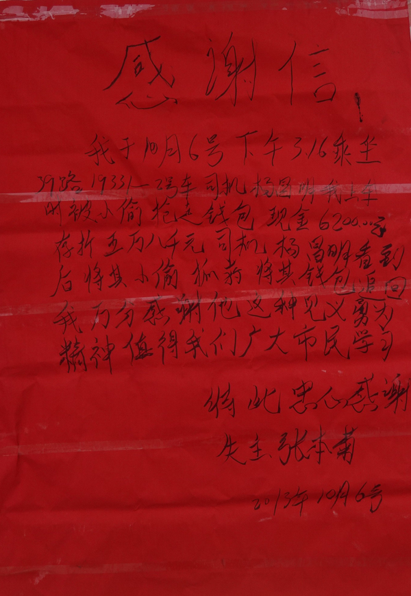 就在大家為這名錢包被偷的女子惋惜時(shí),一名穿紅色T恤、黑色褲子的男子趁亂穿過馬路匆匆離開,坐在后排的一位乘客再也忍不住,大喊起來:"我看到就是他偷的!"此時(shí),紅T恤男子已經(jīng)朝金龍泉大道啤酒廠方向走去。司機(jī)楊昌明見狀,立即開門,跳下駕駛室邊追邊大喊"站住"。聽到喊聲,紅T恤男子撒腿就跑,楊昌明和兩名熱心乘客緊跟著追去。眼見楊昌明和兩名熱心乘客越追越近,紅T恤男子將一個(gè)紅色錢包丟在了地上,楊昌明將錢包撿起后沒再追趕。當(dāng)楊昌明返回車上,女失主卻已經(jīng)不見了,在一車乘客的見證下,楊昌明打開錢包,發(fā)現(xiàn)錢包內(nèi)有6200元現(xiàn)金和一些存款單。為了不耽誤車上的乘客出行,楊昌明暫時(shí)將錢包保管,驅(qū)車離開。